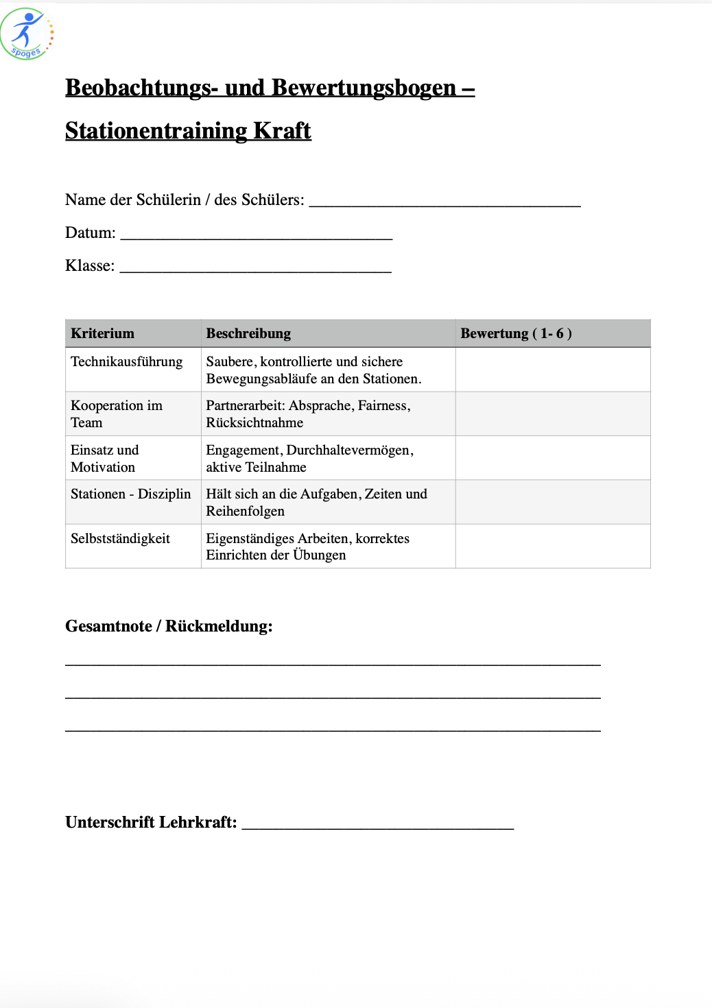 7 Beobachtungsbogen für Lehrkräfte für den Fitnesszirkel „Krafttraining“